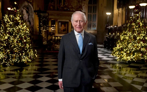 Decorated Christmas trees as backdrop to King Charles III delivering his Christmas Message on December 25, 2025. [web preview]