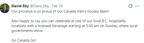 The Province has announced that licensed premises will be allowed to open at 5:00 am on Sunday morning, February 22.