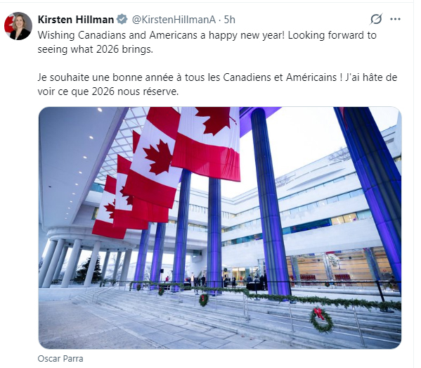“Wishing Canadians and Americans a happy new year! Looking forward to seeing what 2026 brings.” ~ Kirsten Hillman, Canadian Ambassador to the United States