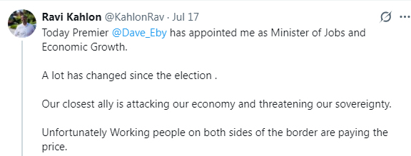 “We’re in a unique time when it comes to the history of this province when it comes to the challenges our country is facing right now,” said Kahlon now in his new role a Minister of Jobs and Economic Growth.