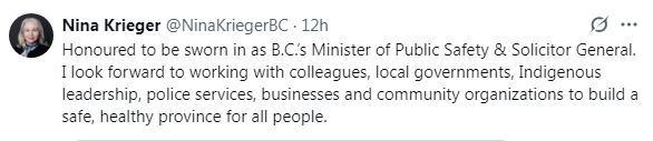 - Nina Krieger, Minister of Public Safety and Solicitor General. She moves from being the Parliamentary Secretary for Arts and Film.
