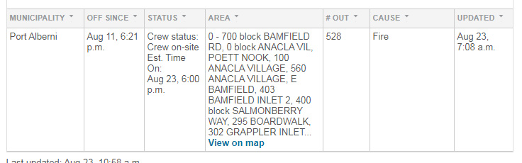 Today, 12 days after the wildfire was first reported, BC Hydro says they will have power back on by around 6 pm this evening, August 23.