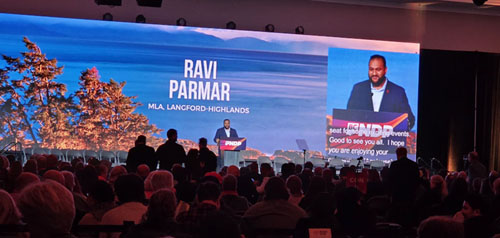 Before lunch on Saturday, MLA Ravi Parmar (Langford-Highlands) delivered a tribute to the late John Horgan — poignantly on his 31st birthday which ushers Parmar beyond being a youth member of the BC NDP.