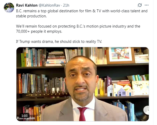 “The resilience of our sector remains strong.” said Kahlon, adding that the Minister of Tourism, Arts, Culture and Sport (Anne Kang) has been working with stakeholders to help diversify the film sector to work with other trade partners. “People have been working on being not so dependent on the United States,” the Minister said today.
