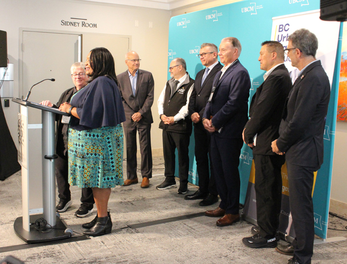 Victoria Mayor Marianne Alto as co-chair of the BC Urban Mayor’s Caucus (BCUMC) led a press conference on day one of the 2025 UBCM convention in Victoria today. She shared the podium with UBCM President Trish Mandewo (Coquitlam City Councillor).