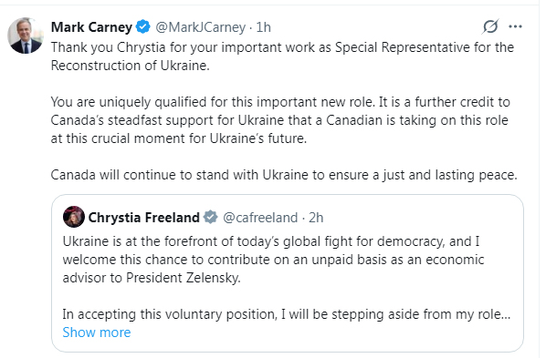 “Thank you Chrystia for your important work as Special Representative for the Reconstruction of Ukraine. You are uniquely qualified for this important new role. It is a further credit to Canada’s steadfast support for Ukraine that a Canadian is taking on this role at this crucial moment for Ukraine’s future. Canada will continue to stand with Ukraine to ensure a just and lasting peace,” said Carney in his social media post.