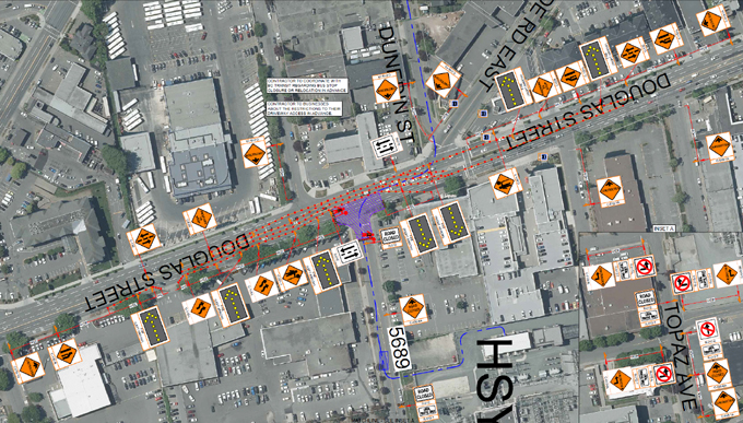 While work is underway, there will be no left turns onto Burnside Road for northbound Douglas Street traffic. For the first week or two, there will be no access to Topaz Avenue from Douglas Street.