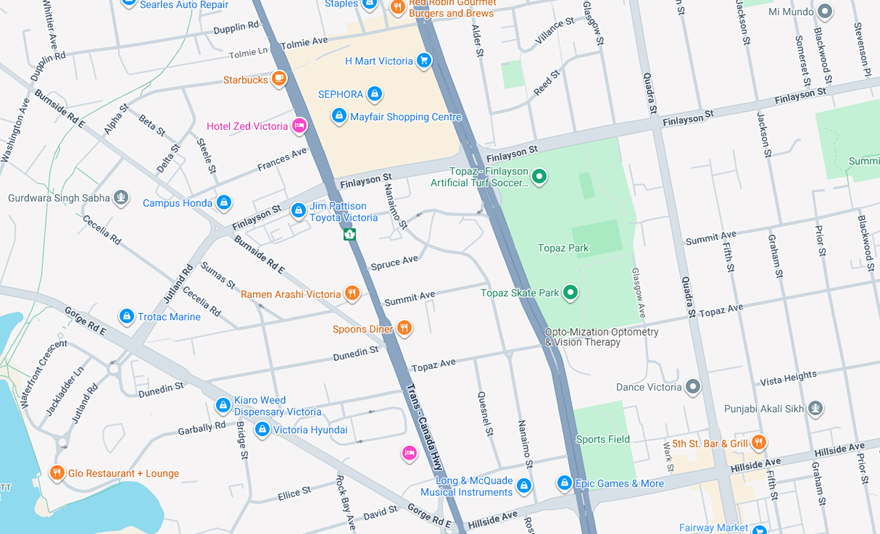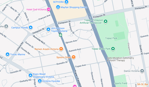 The route is key through the commercialized area of downtown Victoria including Mayfair Mall and stores on Douglas Street in that area.