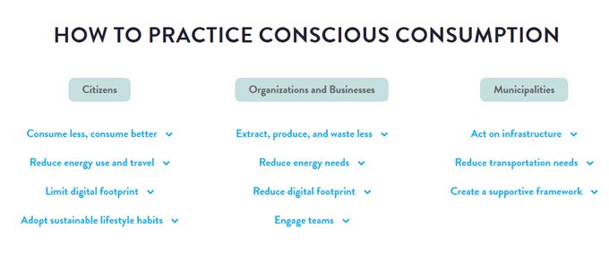 The idea of conscious consumption applies both to individual choices and how people organize collectively — by rethinking modes of production, consumption and transportation, as well as the human relationship to energy, digital technologies and materials.