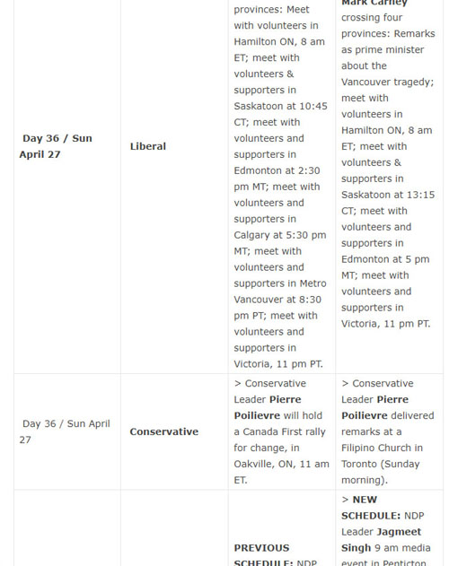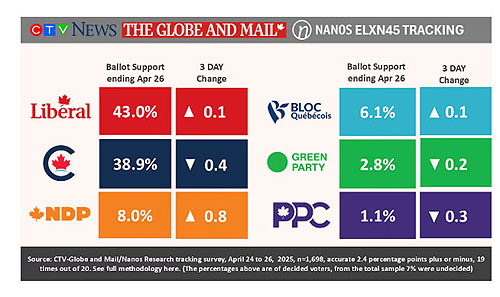 Meanwhile, we note that the latest poll this evening April 27 (by Nanos for CTV) shows the Liberals at 42%, Conservatives at 39%, and the NDP at 10%. That shows the NDP two points higher than a poll (by Nanos for The Globe and Mail) done in the three days previous (April 24 to 26) which showed the Liberals at 43%, Conservatives at 38.9% and the NDP at 8%.