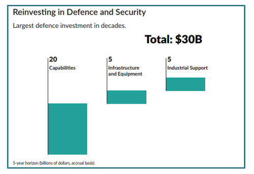 - Investing in defence and security: Our government is making a generational investment in defence that will create good, high-paying careers for Canadians, and strengthen our economy and collective resilience.
