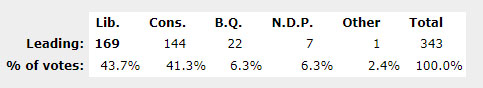 - Liberal 169 | Conservative 143 | Bloc 23 | NDP 7 | Green 1 (updated on May 2)
