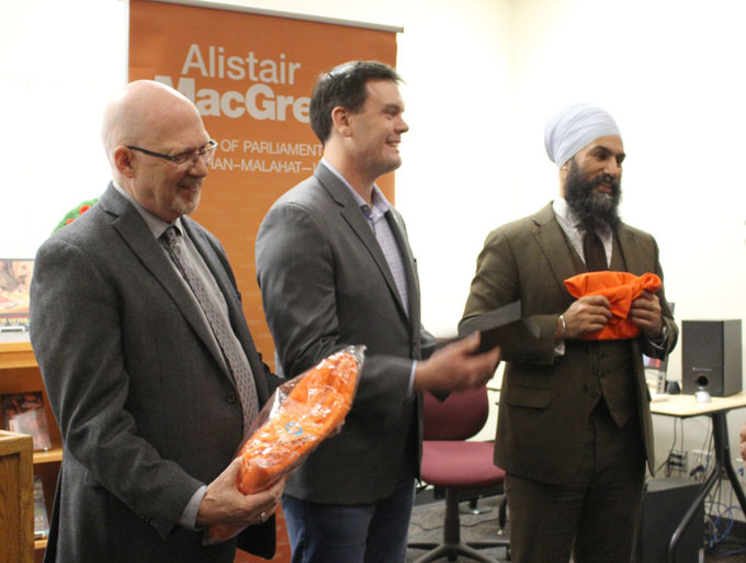 Alistair MacGregor, MP (Cowichan-Malahat-Langford) was joined by federal leader Jagmeet Singh (right) and Randall Garrison, MP at an event in Langford [Mary P Brooke / West Shore Voice News – Nov 2018]