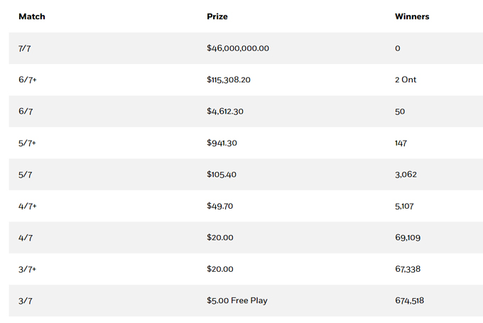 - Two (2) winners in Ontario with 6/7+ numbers, each winning $115,308.20.