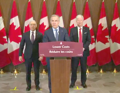 Carney was flanked by Energy Minister Tim Hodgson and Finance Minister Francois-Philippe Champagne at today’s press conference.