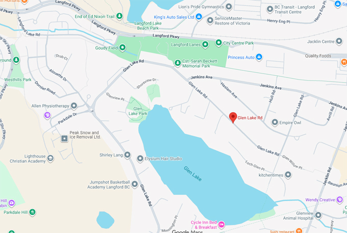 Glen Lake Road / Jenkins Road offers access to the back side of Starlight Stadium and the parking lot for Belmont Secondary School near City Centre Park and the Goudy sports field.