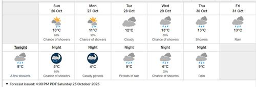 Mainly cloudy. 60 percent chance of showers in the afternoon. Wind west 30 km/h gusting to 50 becoming light in the morning. High 10. UV index 1 or low.