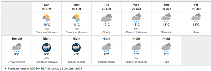 Rainy from Tuesday evening through to and including Friday which is Halloween (October 31).