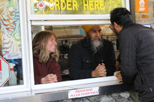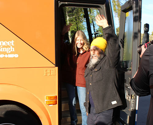 Jagmeet Singh arrived in his campaign bus around 6:30 pm on Niagara Street at Douglas Street at the Beacon Drive-In Restaurant, across from Beacon Hill Park near Mile Zero.