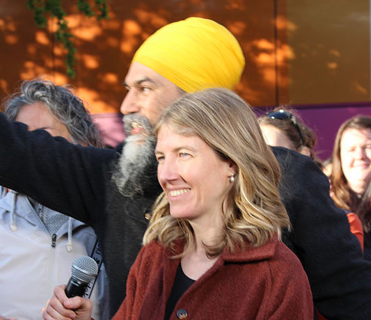 Singh told the rally crowd yesterday evening that coming to Victoria puts a bounce in the campaign team’s step; there is long-standing NDP support in the region and the spring-like weather is a boost.