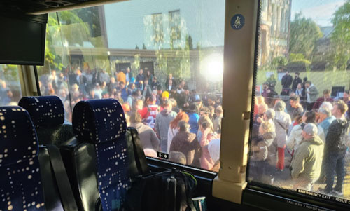 There are three NDP campaign buses for this election. The ones in Ontario and Quebec have a kitchen on board. All the buses are set up for wi-fi and desktop workspace for media. The theme-wrapped buses appear as though they have no windows, but from the inside looking out there is a view through netted screens.