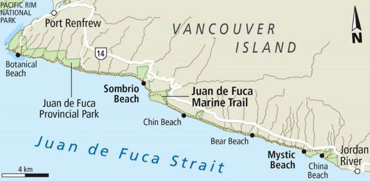 Spanning part of Vancouver Island’s southwest coast, the Juan de Fuca Marine Trail is designed for challenging day or multi-day hikes through rugged, coastal terrain that is often affected by wet and extreme weather.