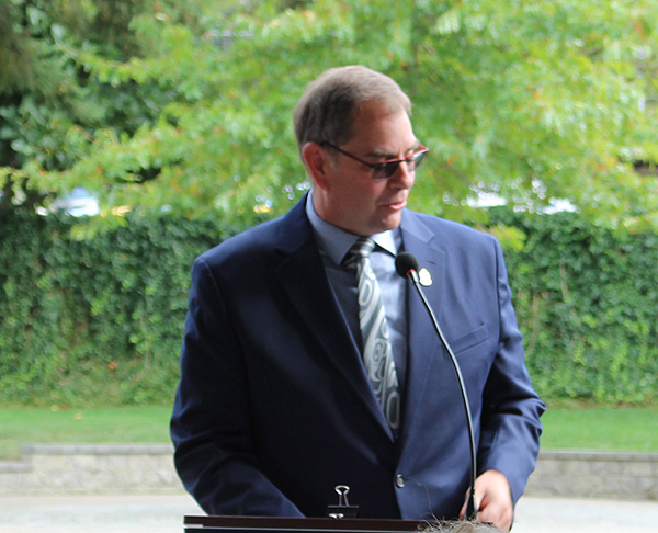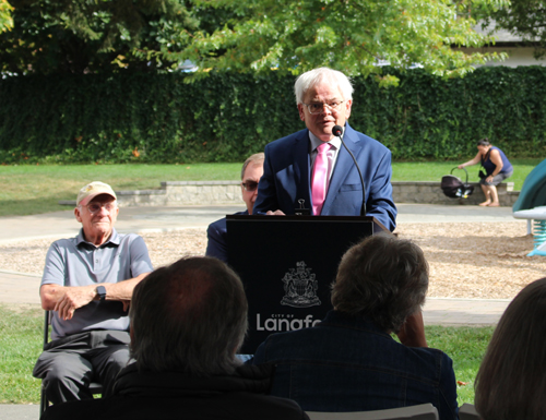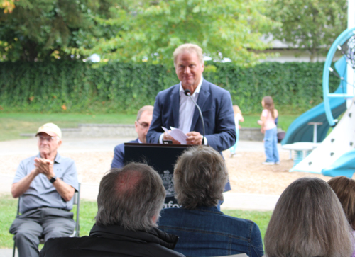 With a dash of humour and political history-telling, former long-time Langford Councillor Lanny Seaton at the podium recalled how Langford emerged as a municipality in the west shore. He recalled memories of Station Road, Jacklin Road and Goldstream Avenue as they used to be as well as the former Langford Elementary which is now Ruth King Elementary.