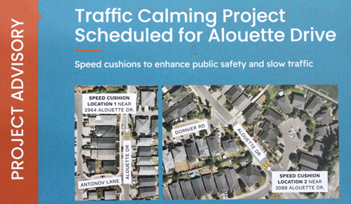 A post card with this information was mailed to residents in recent days. Residents were advised that “Alouette Drive qualifies for traffic calming under the City’s Traffic Calming Policy.