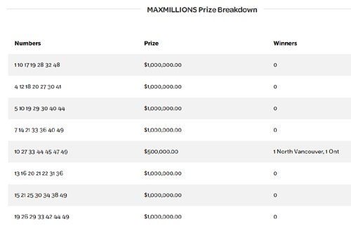 For the Maxmillions, two ticket holders (one in North Vancouver and one in Ontario) each won $500,000 in last night’s draw.