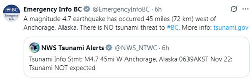 Earthquake west of Anchorage, Alaska on Sat Nov 22, 2025. [Emergency Info BC]