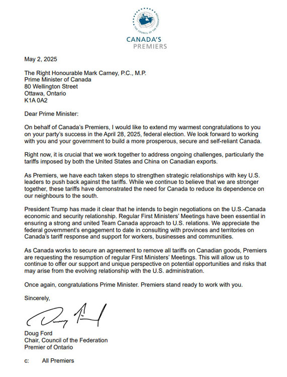 They issued their letter — signed by Ontario Premier Doug Ford as Chair of the Council of the Federation (COF), after re-elected Prime Minister Mark Carney delivered his first speech in Ottawa since the election.