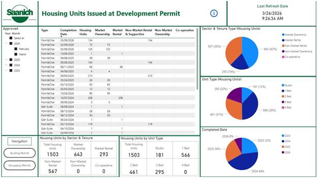 Saanich has launched a Housing Dashboard that provides a comprehensive view of new residential construction and future development across the District. It brings together data on Development Permit approvals, Building Permit approvals and Occupancy Permit approvals, to help users track development activity and new housing that is being delivered.