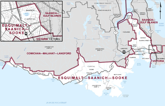Esquimalt-Saanich-Sooke is a geographically large riding encompassing various areas of south Vancouver Island including the municipalities of Colwood, Esquimalt, Juan de Fuca (out to Jordan River), Metchosin, Saanich, Sooke, and View Royal and three First Nations (Beecher Bay, Songhees and T’Sou-ke).