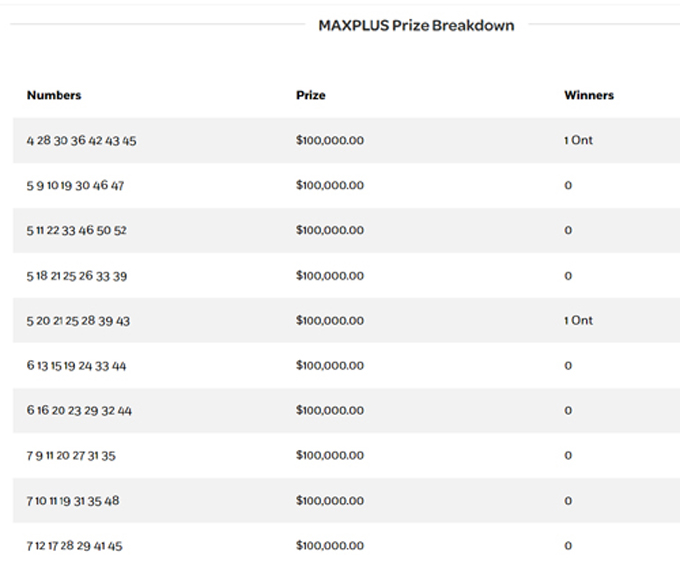 - Winner – Ontario – 5 20 21 25 28 39 43