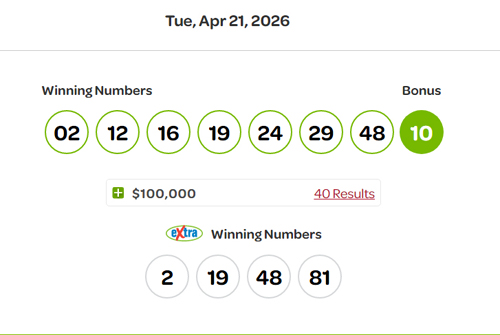 The winning numbers for the April 21, 2026 Lotto Max draw are: 02, 12, 16, 19, 24, 29 and 48. Bonus: 10.