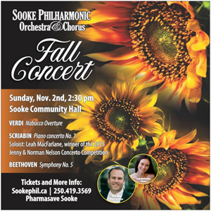 The 2025 Fall Season concert by the Sooke Philharmonic Orchestra will be held on Sunday November 2 at Sooke Community Hall, 2037 Shields Road in downtown Sooke.