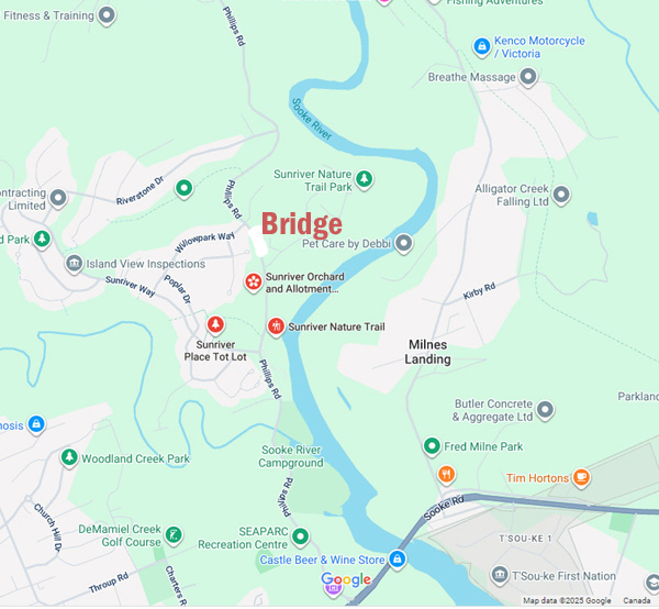 It’s a small two-lane bridge (divided down the middle) connecting Sunriver Estates and rural properties beyond to the rest of Sooke, quite literally the one-road-in/out for residents. A slower driving speed is expected and required.