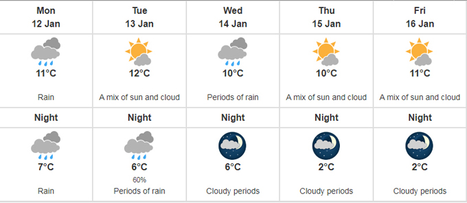 The temperature is forecast as steady near 8°C.
