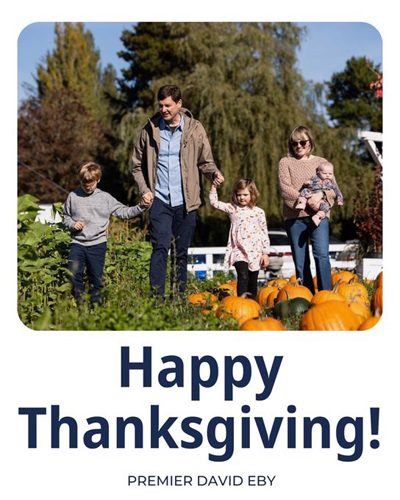 BC Premier David Eby: Premier Eby is spending the Thanksgiving holiday with his family, posting a photo in social media with this message: “Thank you everyone who makes British Columbia an outstanding place to live.”