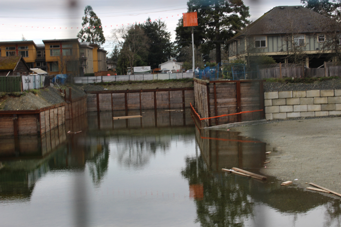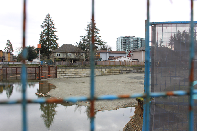 A development called The Scene is still a hole in the ground on Scafe Road in central Langford, Feb 12, 2026. [Mary P Brooke / Island Social Trends]