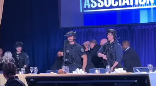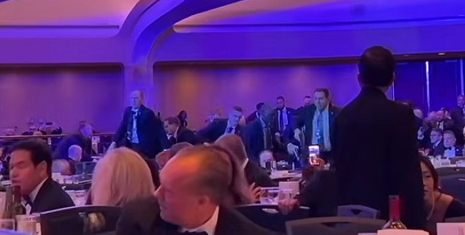 Through the lobby, the shooter made a fast run for the doors of the ballroom but was taken down by special security before he could reach the room full of elected leaders and Washington press corps journalists who were behind closed (reportedly locked) doors for the White House Correspondents Dinner.