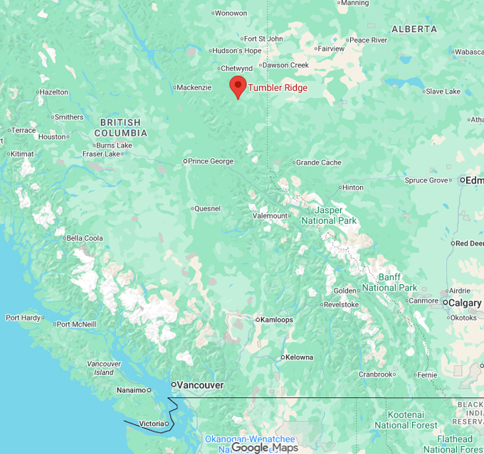 Update at 6:30 pm (per reports on CBC News) – Six people were found dead in the secondary school; one died on the way to hospital. Communities beyond Tumbler Ridge are in the search zone, including Dawson Creek and Chetwynd.