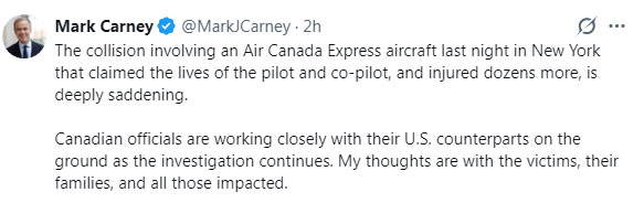 Prime Minister Mark Carney said the crash is “deeply saddening” and that “Canadian officials are working closely with their U.S. counterparts on the ground as the investigation continues. My thoughts are with the victims, their families, and all those impacted”.