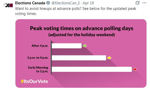 Advance voting runs for four days through this Easter long weekend (Friday April 18 through Monday April 21). The 45th Canadian federal election is on Monday April 28.