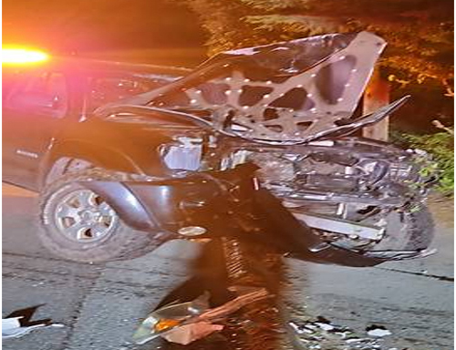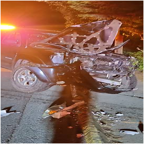 Upon arrival, officers located a black Toyota Tacoma with extensive front-end damage after it had struck a power pole.