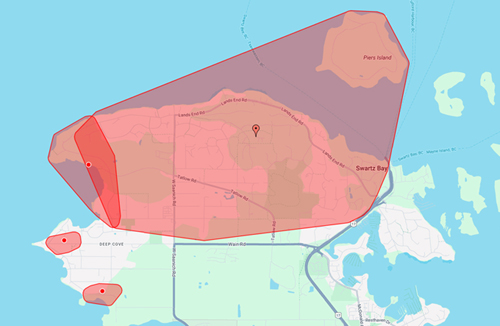 Power outage in North Saanich including near the BC Ferries Swartz Bay terminal, Dec 15, 2025. [BC Hydro map - 9:47 pm]