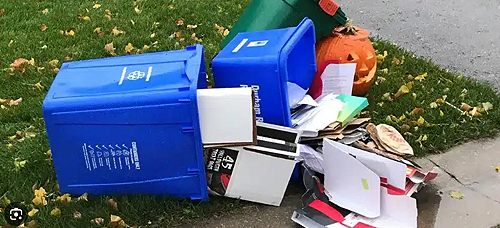 Recyclable materials that become scattered outside of the boxes can create neighbourhood clutter, cause safety issues (flying objects, or being driven over by vehicles), and reduce the amounts that are normally expected as intake to the recycling system.
